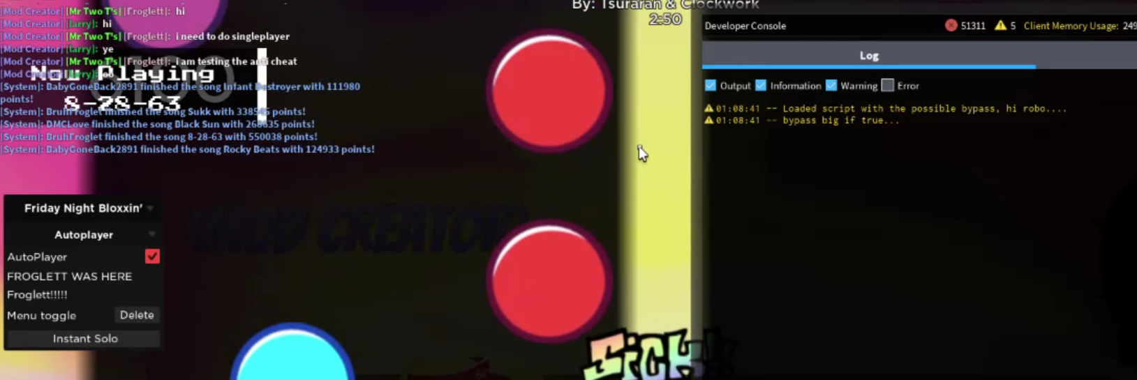 Friday Night Bloxxin - got paid 30k robux for an anti cheat bypass. They had anti cheat to detect autoplayers and this bypass let you have 100% accuracy in any song no matter what.